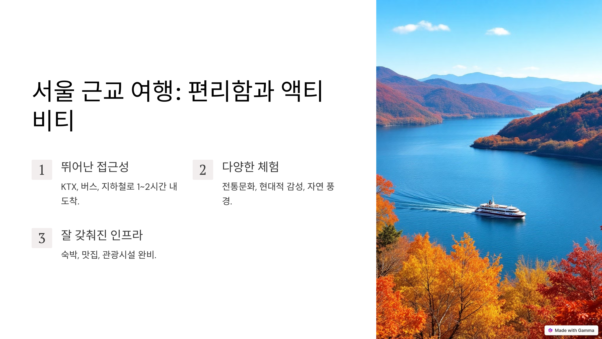 1. 서울 근교 여행 – 편리함과 다양한 액티비티