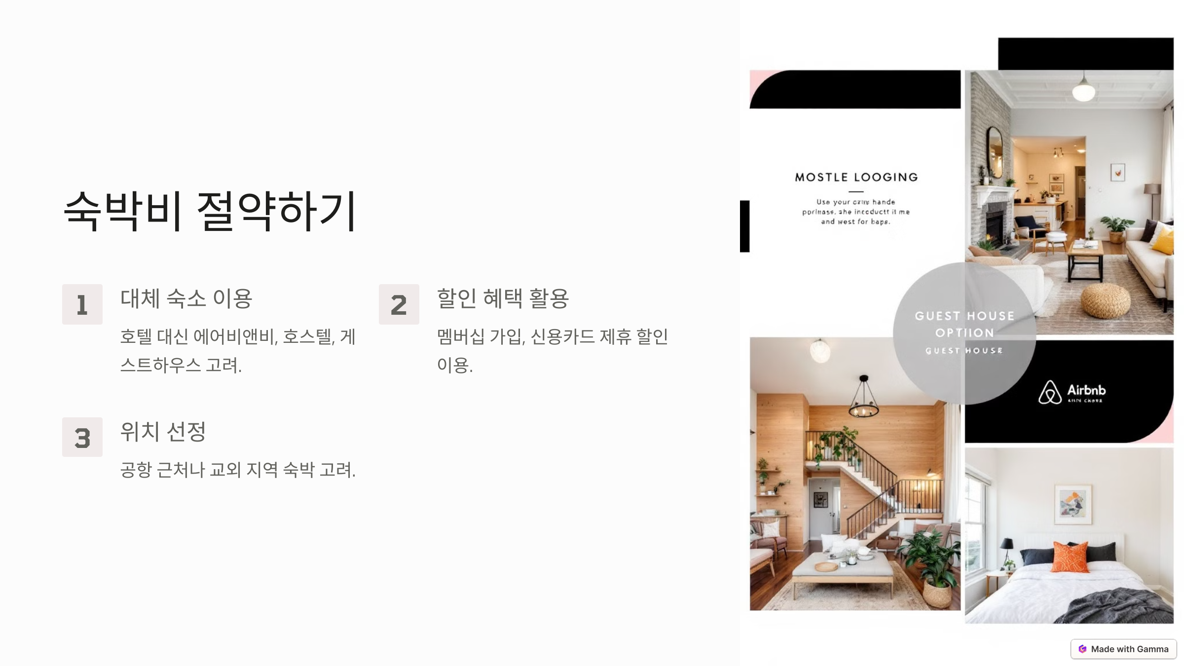 - 호텔보다 에어비앤비, 호스텔, 게스트하우스를 이용하면 훨씬 저렴한 가격에 숙박할 수 있습니다.