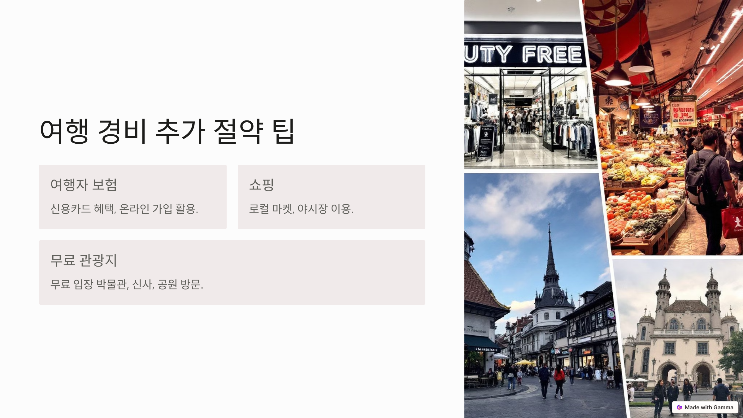 - 유럽 여행 시 현지 마트에서 치즈, 빵, 햄을 구입해 간단한 식사를 준비하는 것도 추천