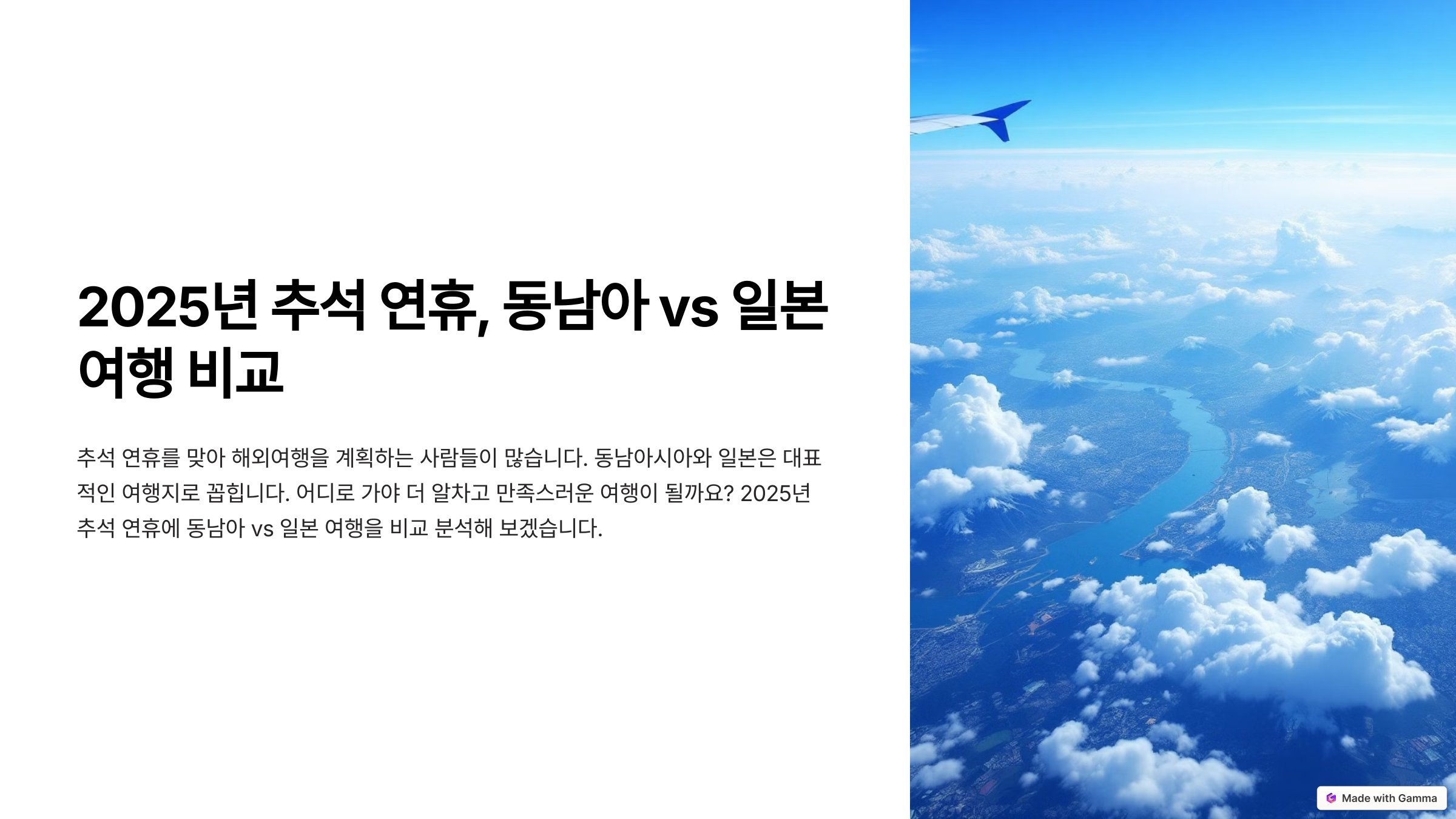 추석 연휴를 맞아 해외여행을 계획하는 사람들이 많아지고 있습니다. 특히, 비교적 가까운 거리와 다양한 문화적 매력을 가진 동남아시아와 일본은 대표적인 여행지로 꼽힙니다. 하지만 어디로 가야 더 알차고 만족스러운 여행이 될지 고민이 될 수 있습니다. 이번 글에서는 2025년 추석 연휴에 동남아 vs 일본 여행을 비교하며, 각 지역의 장점과 단점을 분석해보겠습니다.
