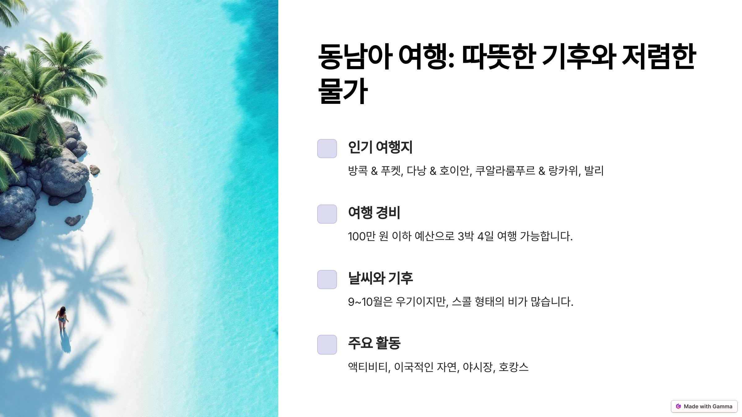 - ✅ 가성비 좋은 여행, 해변과 액티비티를 즐기고 싶다면 → 동남아