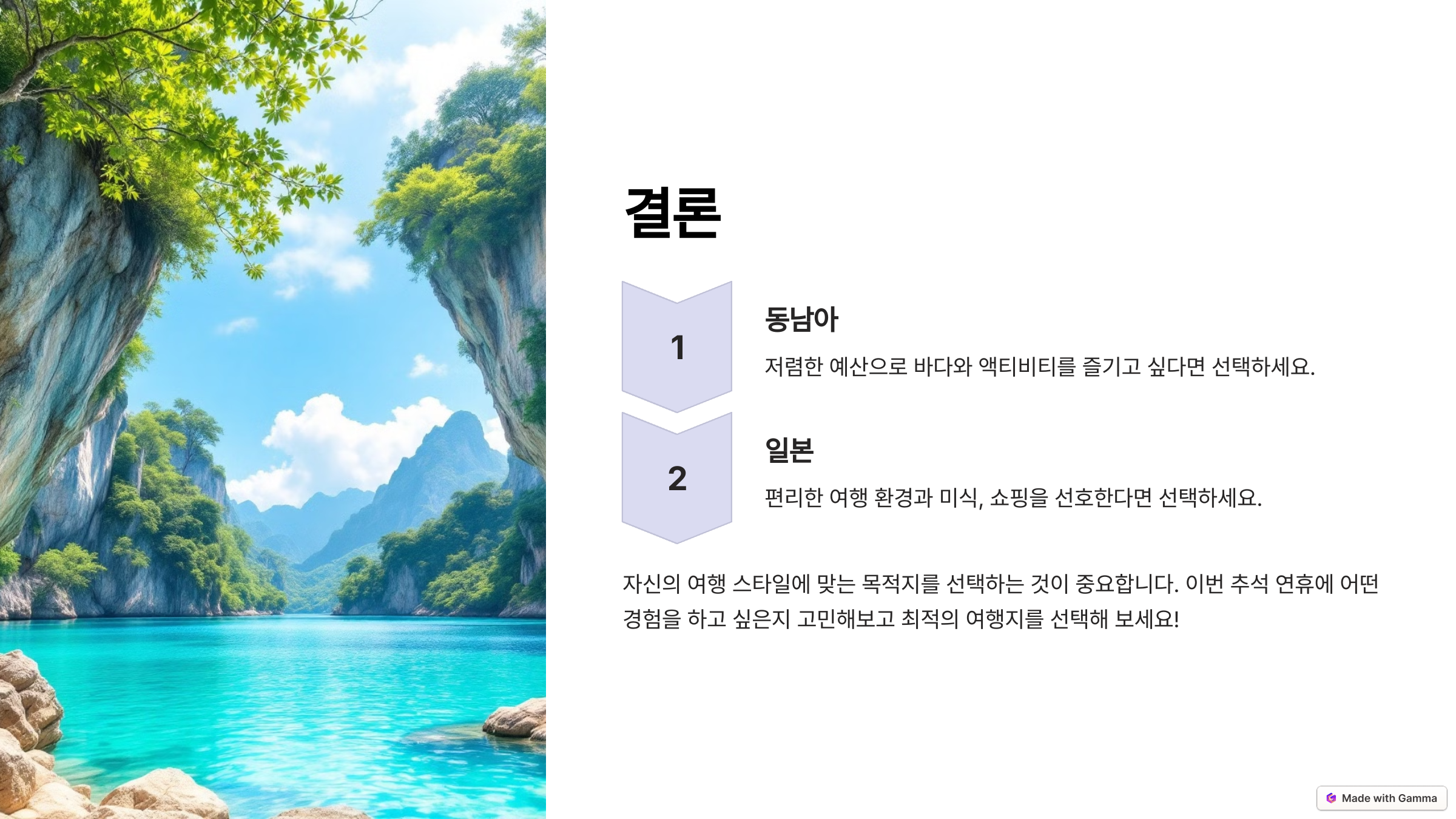 2025년 추석 연휴에 동남아 vs 일본 여행을 고민하고 있다면, 자신의 여행 스타일에 맞는 목적지를 선택하는 것이 중요합니다.