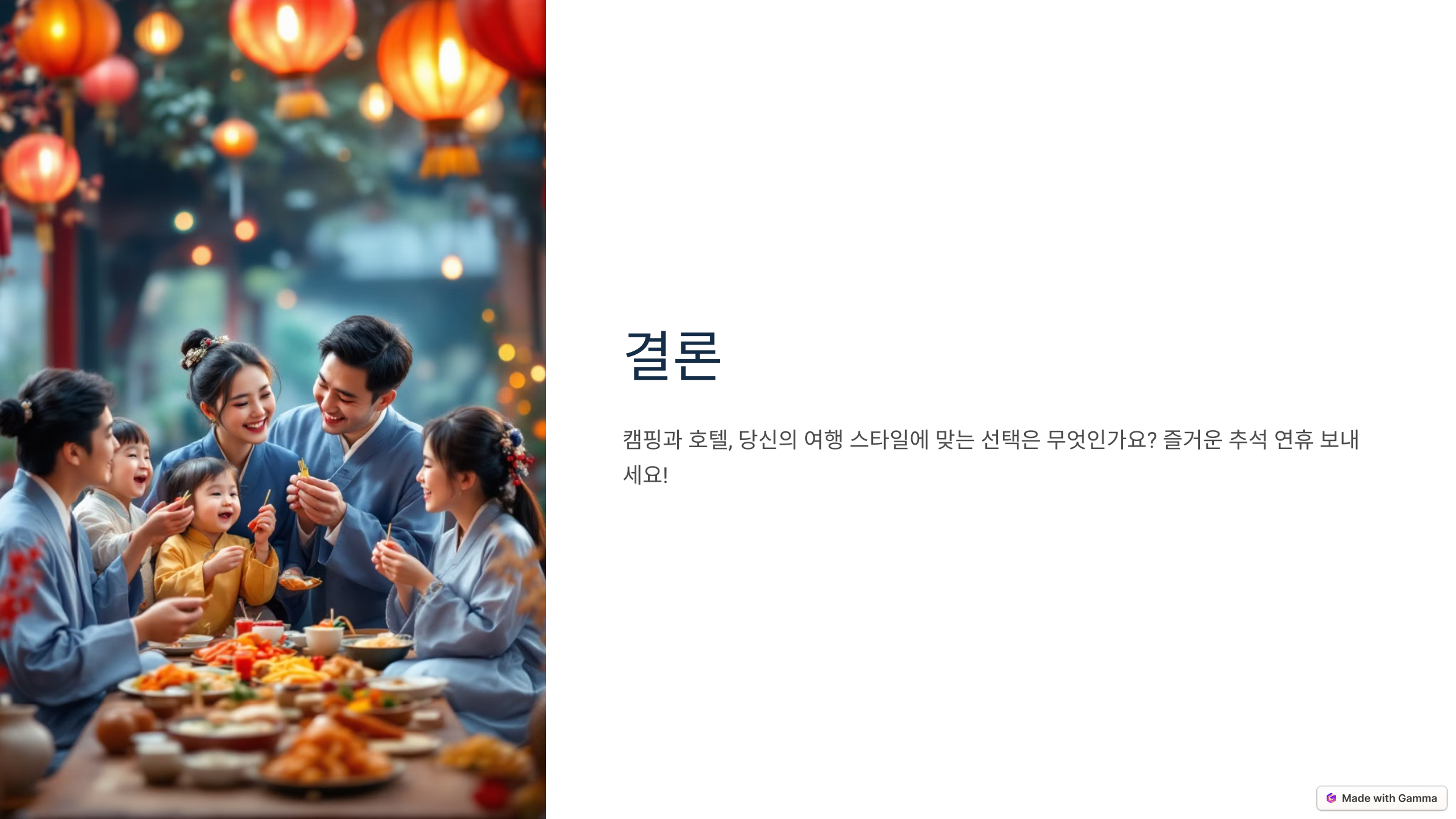 2025년 추석 연휴 동안 캠핑과 호텔 숙박 중 어떤 것을 선택할지는 여행의 스타일과 목적에 따라 달라집니다. 자연을 가까이에서 즐기고 싶다면 캠핑이 좋은 선택이며, 편안한 여행을 원한다면 호텔이 적합합니다. 캠핑과 호텔 모두 각자의 매력이 있으므로 자신의 여행 스타일에 맞게 선택하여 즐거운 추석 연휴를 보내시길 바랍니다.